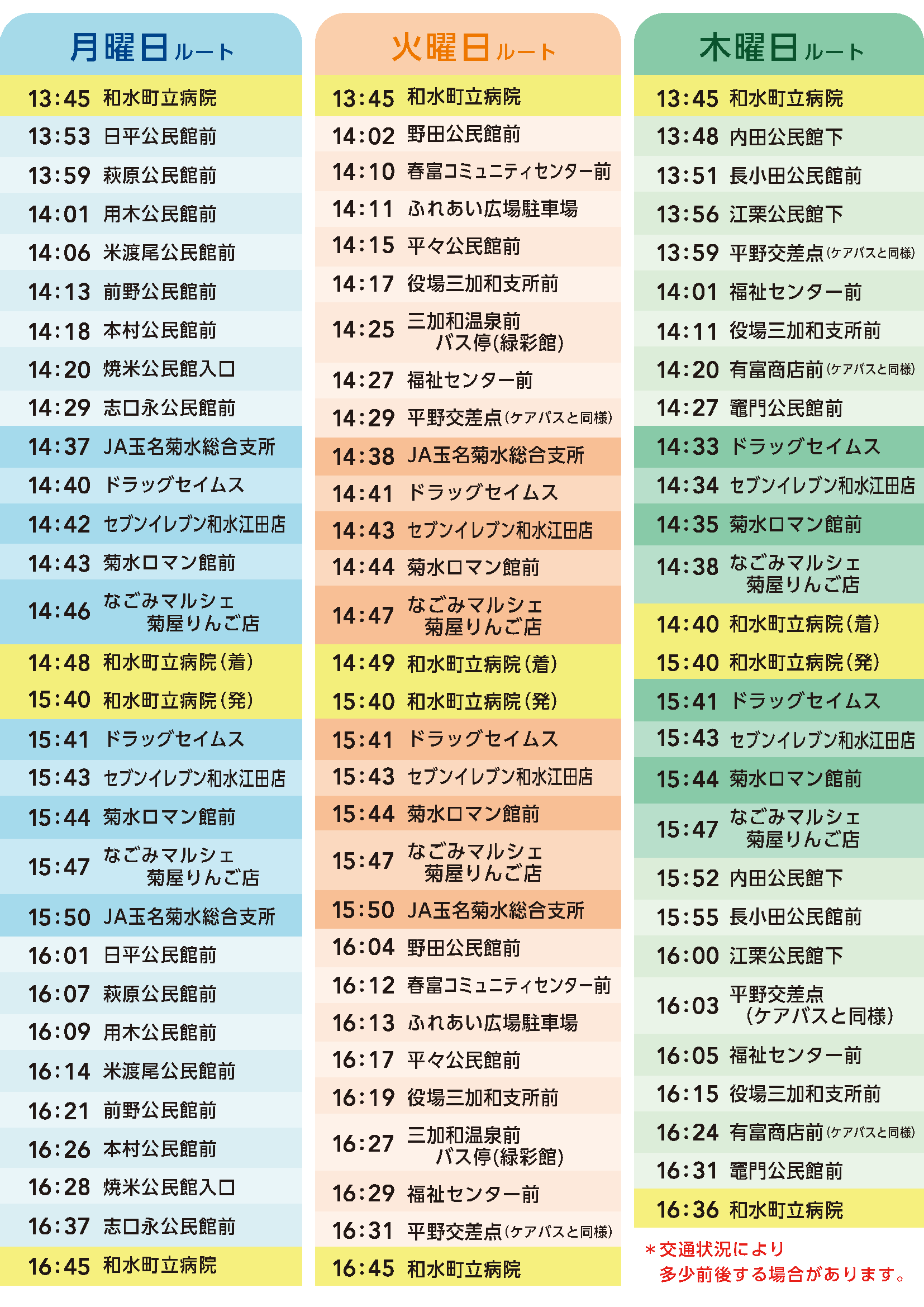 県道 和仁菊水線の全面通行止め(区間:野田区~下吉地区)に伴い、令和8年1月13日から火曜日ルートの時刻表が一部変更となります。