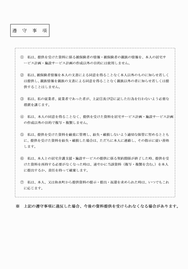 (1) 提供を受けた資料に係る本人の情報(以下「本人情報」という。)又は本人の親族の情報(以下「親族情報」という。)を本人の介護サービス計画の作成以外の目的に使用しないこと。